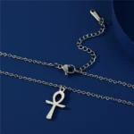 Ce magnifique collier avec pendentif croix de ankh est fabriqué en acier inoxydable et est parfait pour toutes les femmes qui souhaitent porter une pièce d’inspiration égyptienne. Nous proposons ce bijou en deux coloris : or et argent avec deux modèles de chaîne disponibles : chaîne simple ou double. La double chaîne avec sa maille serpent vous donnera un look unique !